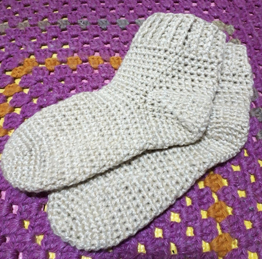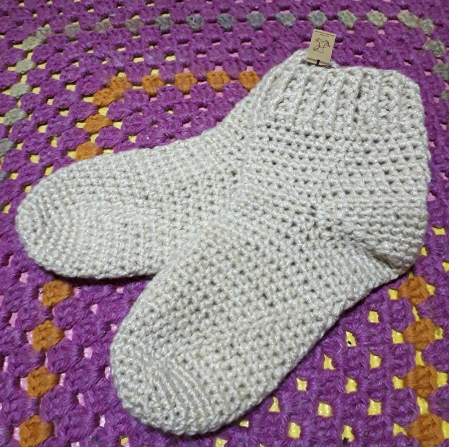 きらきらラメの入ったアクリル毛糸で編んだ、あったか可愛い靴下です。