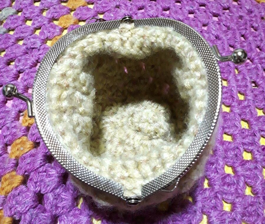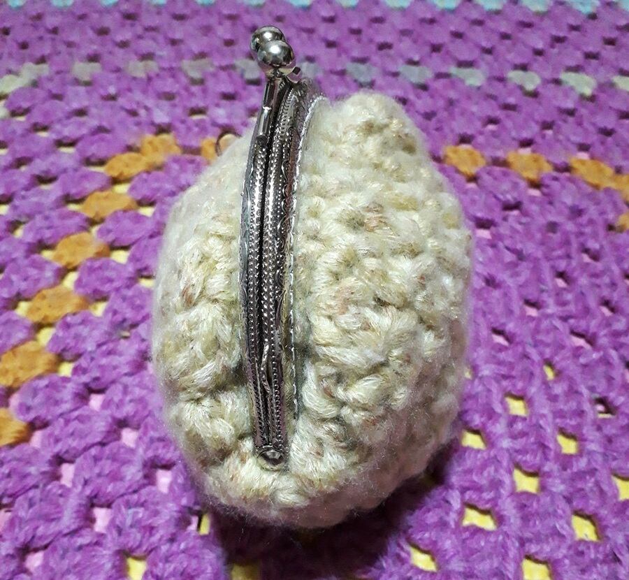 キラキラのラメが入った毛糸で編んだ、少し大きめサイズのがまぐちです。